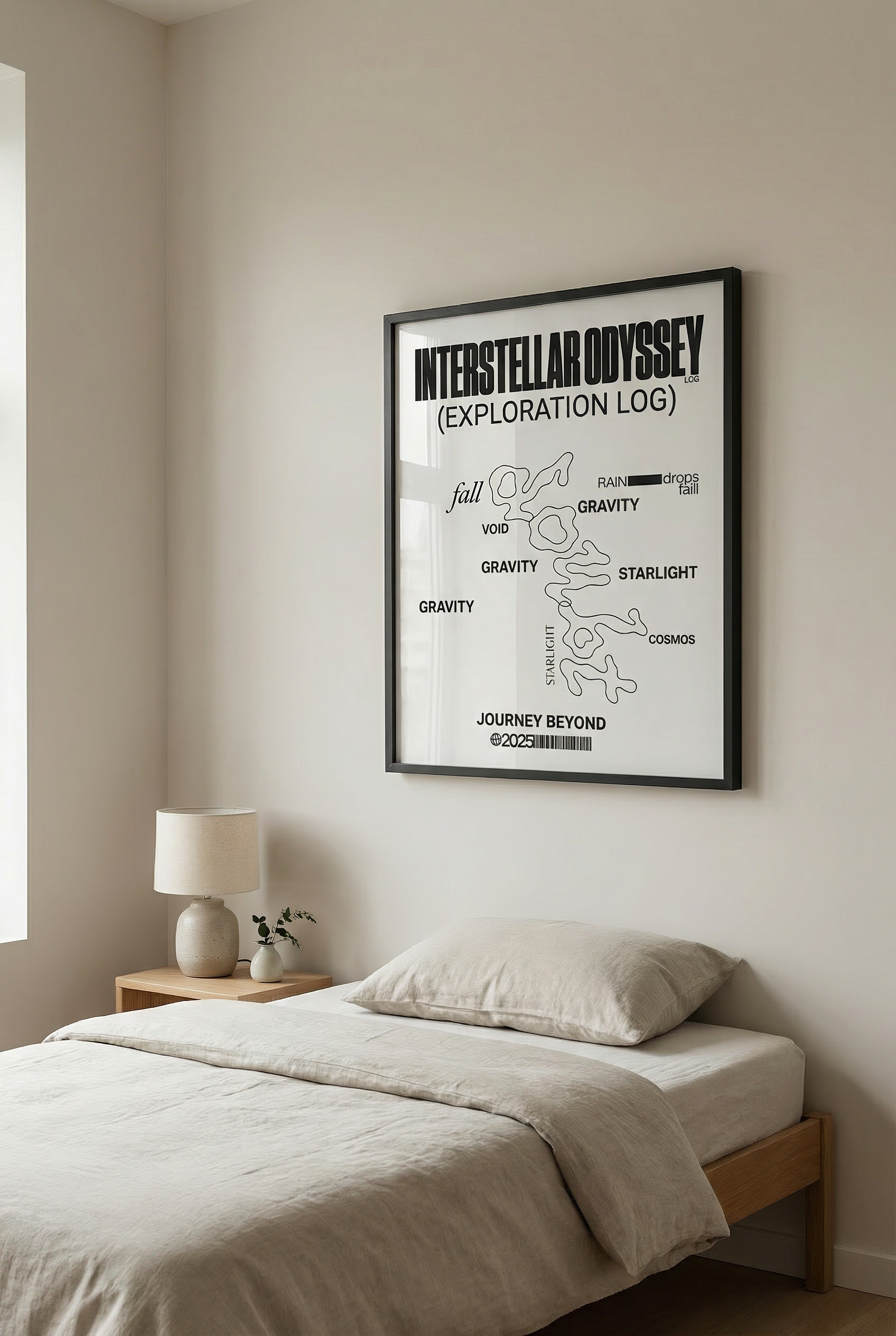INTERSTELLAR ODYSSEY" is a technical yet poetic documentation of a journey through the unknown. Featuring topographic line art and brutalist typography, this "Exploration Log" captures the tension between gravity and the void. A sophisticated piece for those fascinated by the cosmos and minimalist information design.